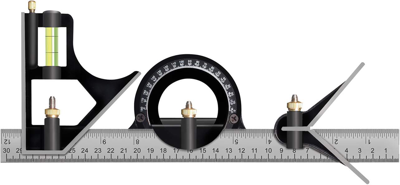 adjustable head with 90¦, 45¦ and 0¦ to 180¦ angle; also comes with level and scribing marker ; center finder head; 12" stainless steel ruler; all heads are zinc alloy with brass thumb screws