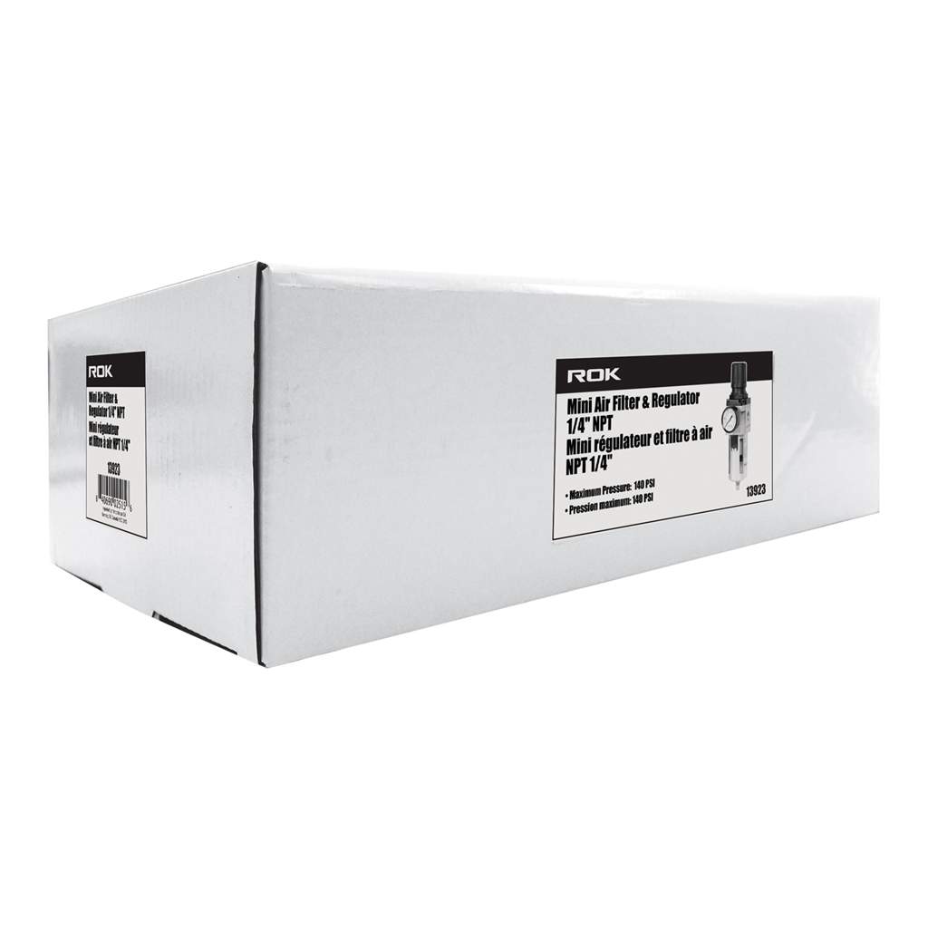 Compact sized for smaller areas; Regulator allows control of air pressure from 7 to 120 PSI; Filter protects air tools from damage caused by rust and moisture; Maximum Pressure: 140 PSI; Air Inlet: 1/4 NPT, Maximum flow rate: 70 CFM