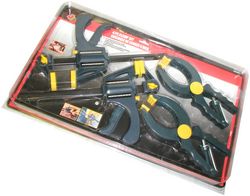 • 2 - 9” trigger quick-release clamps: nylon fiber construction, self-adjusting jaws, variable pressure • 2 - 6” ratchet wood clamps: black ABS plastic grip, ABS protection jaws, ratchet clamping/spreading action with quick-release, steel sliding bar