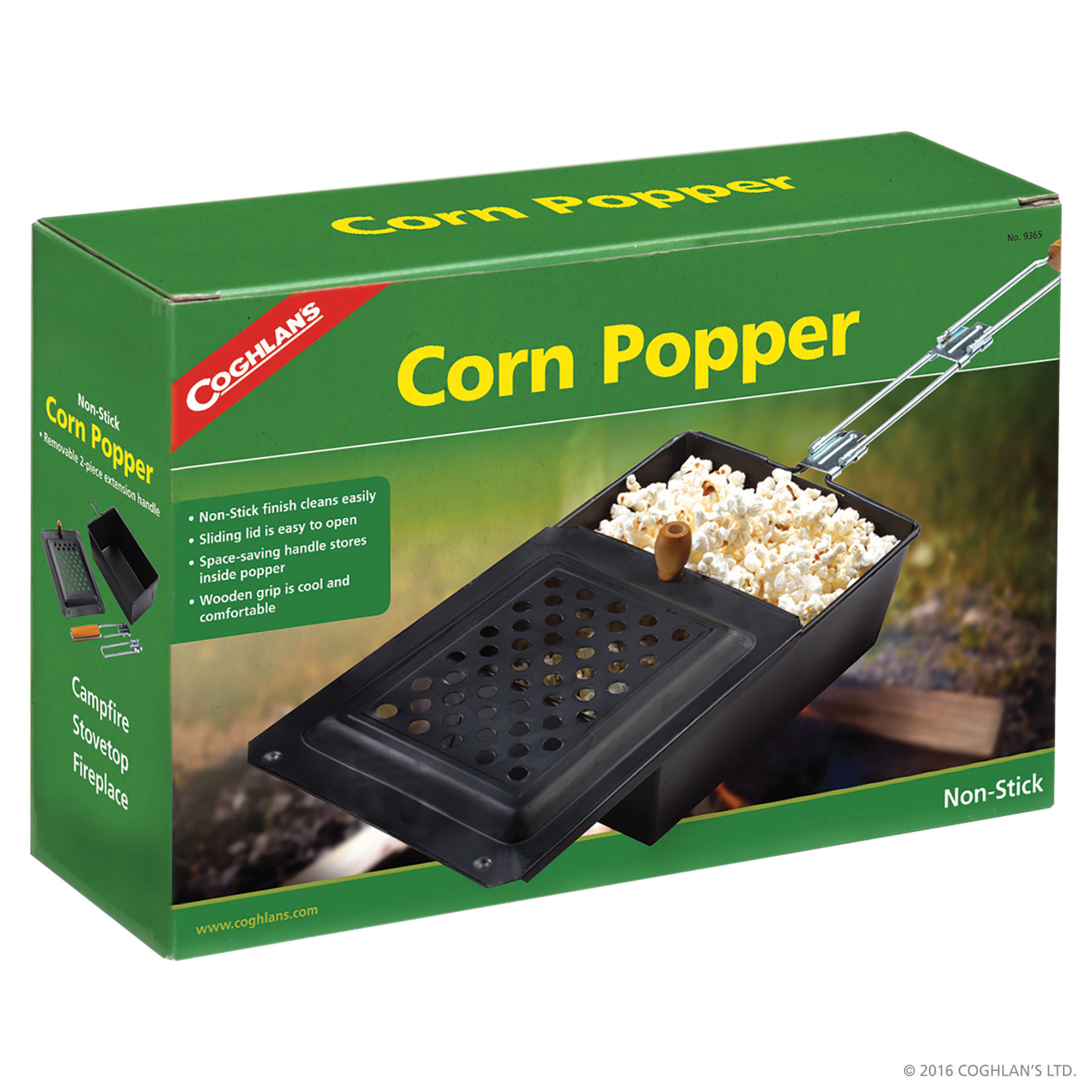 Classic design makes great tasting popcorn every time. Great for roasting chestnuts too! Use over a campfire or fireplace. The sliding lid is easy to open and the space-saving handle stores inside the corn popper when not in use. Wooden grip keeps handle cool and comfortable. Clean up is easy with the non-stick surface.