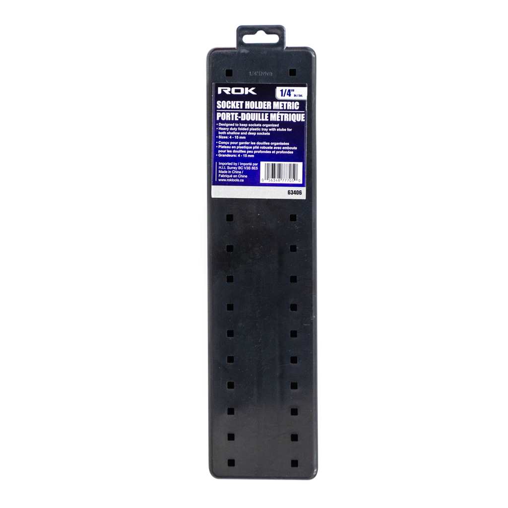 Designed to keep sockets organized Heavy duty plastic tray with stubs for sockets Sizes clearly marked for easy selection Sizes: 4 - 15 mm Holds 14 standard and 14 deep sockets
