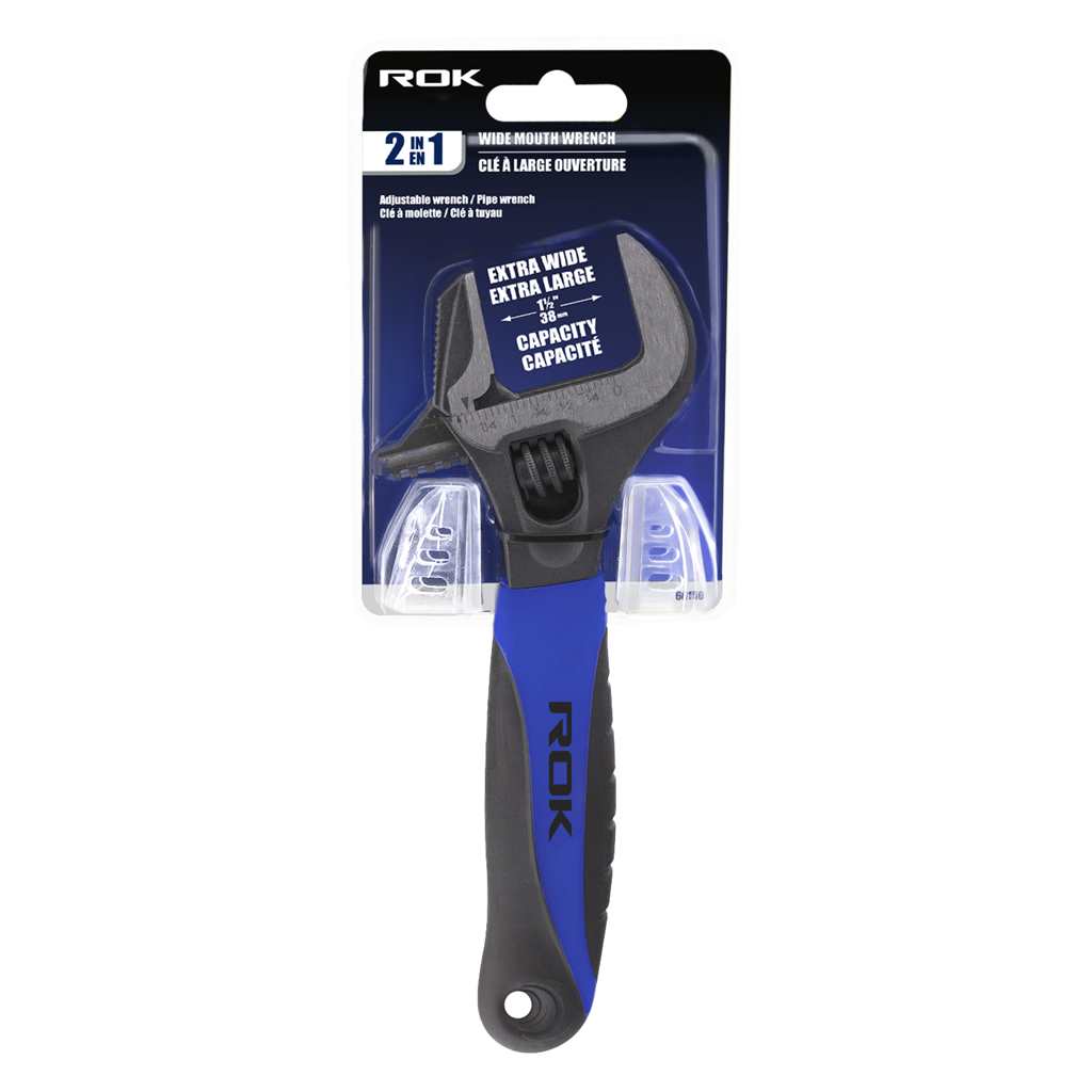 Adjustable wrench converts to pipe wrench when jaw reversed; Adjustable wrench jaw features straight direct contact for nuts and bolts; Pipe wrench jaw features serrated angled jaw allowing for secure contact on pipes; Conveniently wide 1-1/2" jaw opening; Includes plastic jaw covers for protecting surfaces; Easy-to-read SAE and Metric scales on head